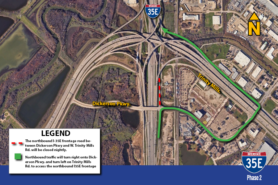 The northbound I-35E frontage road between Dickerson Parkway and Trinity Mills Road will be closed from 9 p.m. Tuesday, October 7 to 6 a.m. Wednesday, October 8 and continue nightly until Friday, October 10.