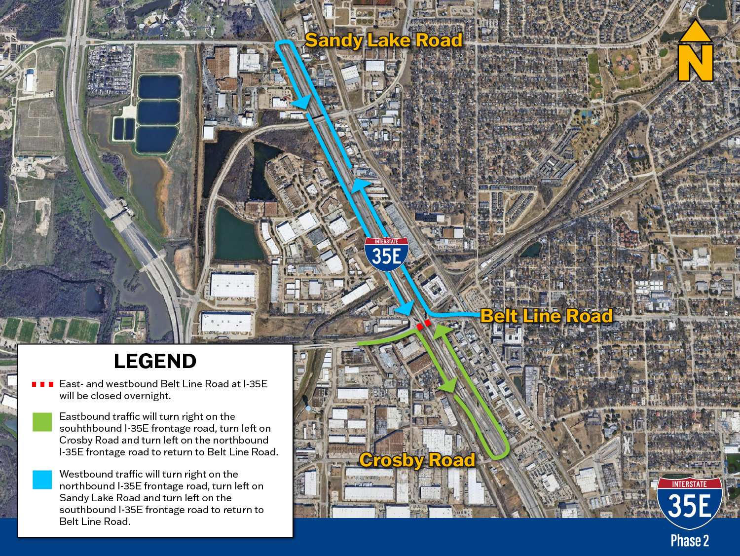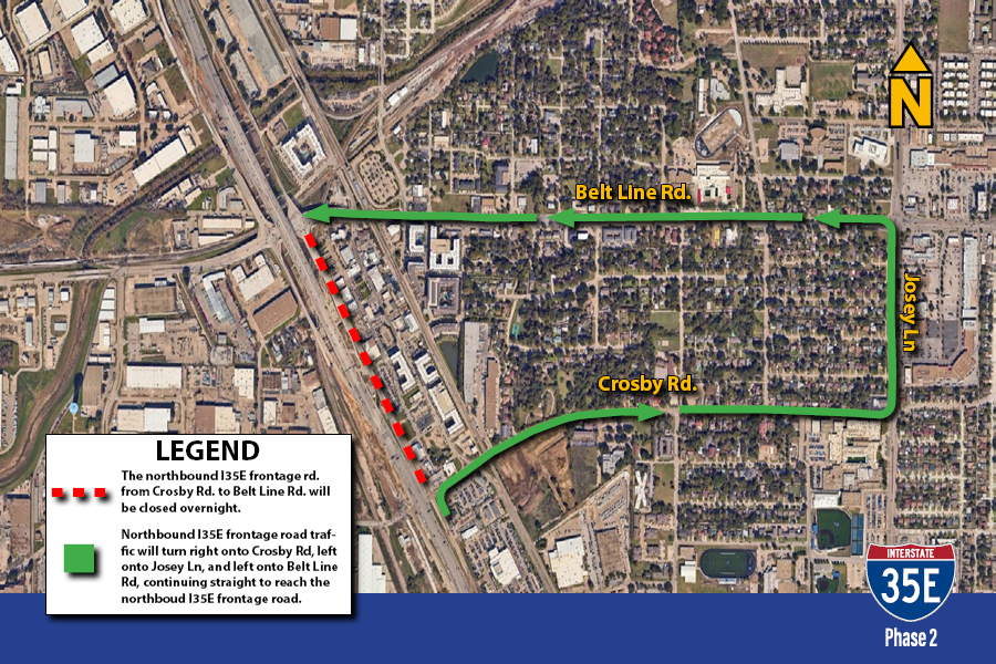 The northbound I-35E frontage road between Crosby Road and Belt Line Road will be closed overnight from 9 p.m. Wednesday, October 8 until 6 a.m. Thursday, October 9.