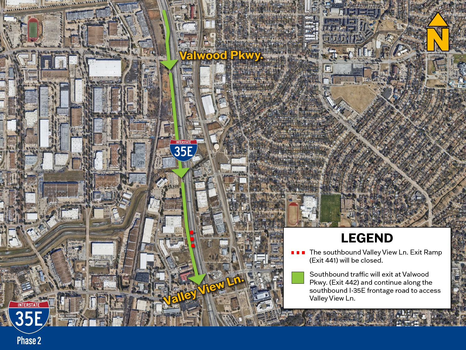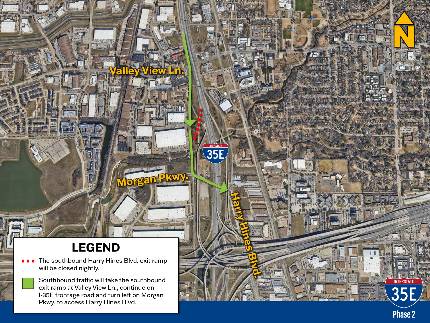 All lanes along Valley View Lane under I-35E will be closed from 9 p.m. Wednesday, October 8 to 6 a.m. Thursday, October 9 and continue nightly until Sunday, October 12.