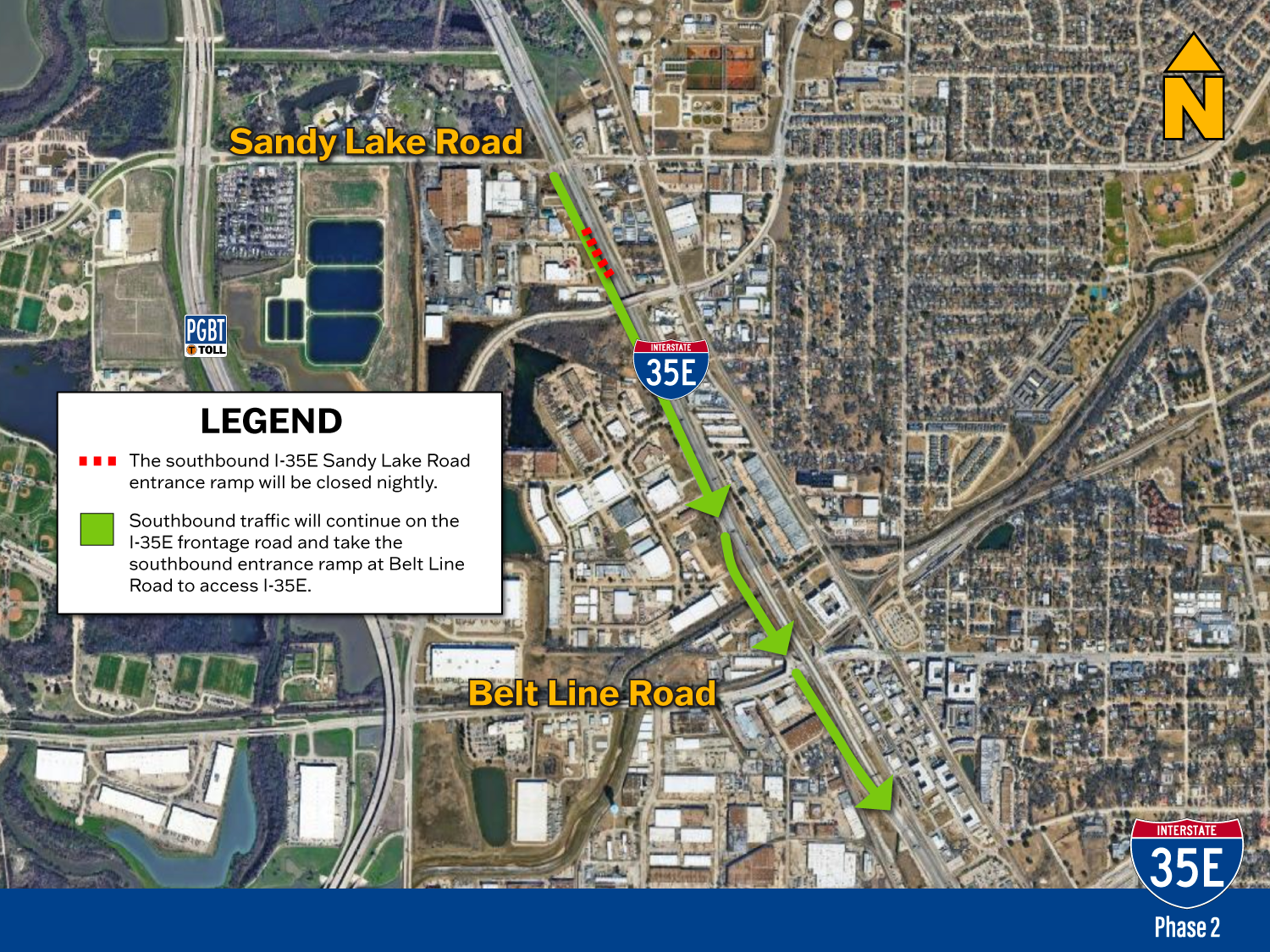 The northbound I-35E frontage road between Crosby Road and Belt Line Road will be closed from 9 p.m. Thursday, January 8 to 6 a.m. Friday, January 9 and continue nightly until Saturday, January 10.