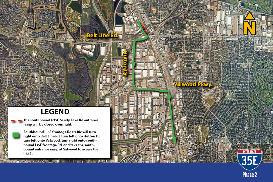The southbound I-35E frontage road between Belt Line Road and Crosby Road will be closed overnight from 8 p.m. Saturday, January 3 until 6 a.m. Sunday, January 4.