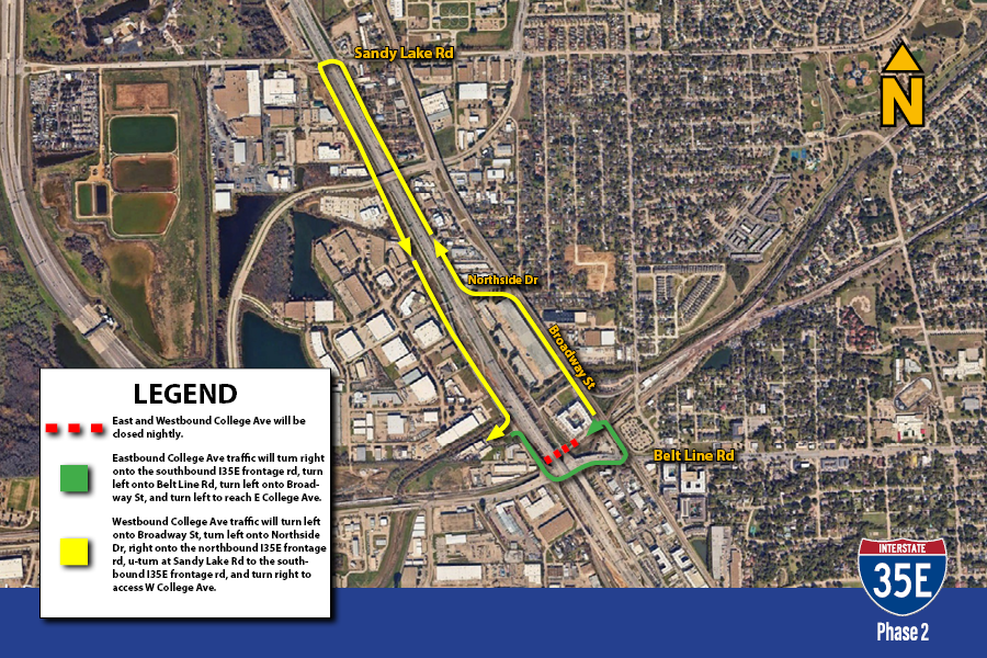 All lanes along College Avenue under I-35E will be closed from 8 p.m. Thursday, April 9 to 6 a.m. Friday, April 10 and continue nightly until Sunday, April 12.