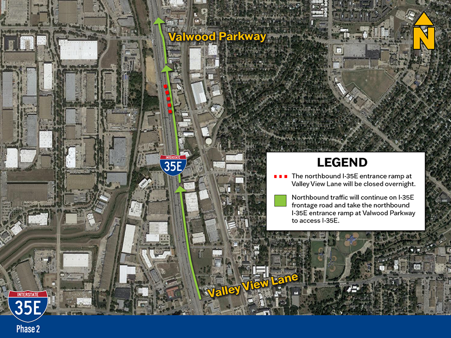 The northbound Valley View Lane entrance ramp will be closed overnight from 8 p.m. Sunday, April 12 until 6 a.m. Monday, April 13.