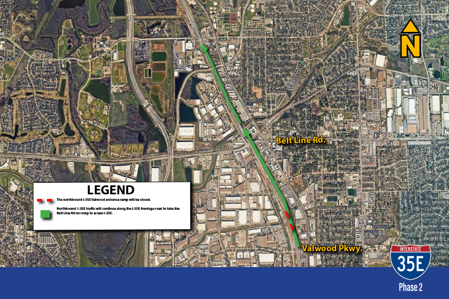 The northbound Valwood Parkway entrance ramp will be closed from 8 p.m. Saturday, April 11 until 6 a.m. Monday, April 13.