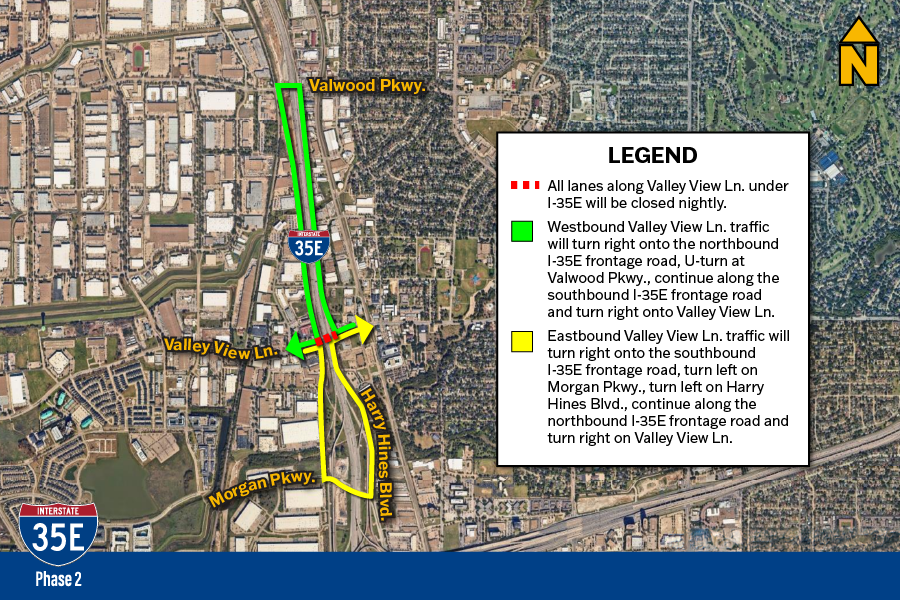 All lanes along Valley View Lane under I-35E will be closed from 8 p.m. Wednesday, April 8 to 6 a.m. Thursday, April 9 and continue nightly until Friday, April 10.