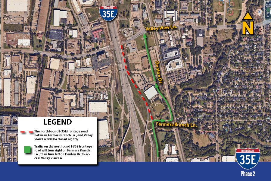 The northbound I-35E frontage road between Farmers Branch Lane and Valley View Lane will be closed from 8 p.m. Friday, January 30 to 8 a.m. Saturday, January 31 and continue nightly until Sunday, February 1.