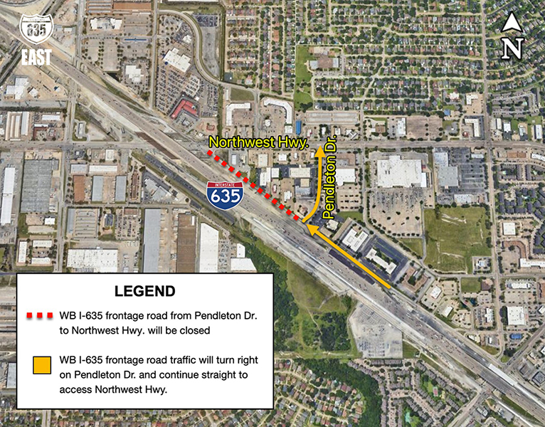 Frontage road All lanes along westbound I-635 frontage road between Pendleton Drive and Northwest Highway |