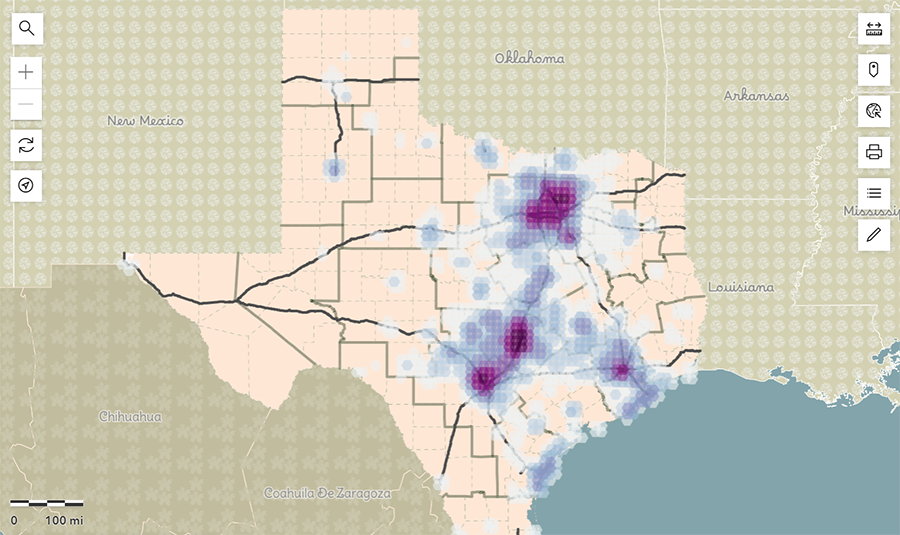 “Using that data, we were able to map wildflower sightings across Texas dating back more than a decade,” said Tom Neville, a TxDOT GIS analyst, who helped develop the new layer. “The dataset was eventually refined, and a heat map was created to show concentrations of wildflower activity across the state.”