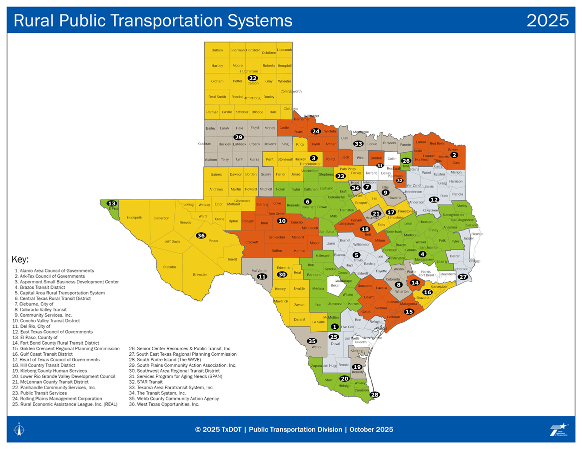 The Rural Public Transportation grants program helps people in rural areas access health care, shopping, education, employment and recreation. Currently, there are 20 operators providing public transportation in rural areas and small cities with populations under 50,000.
