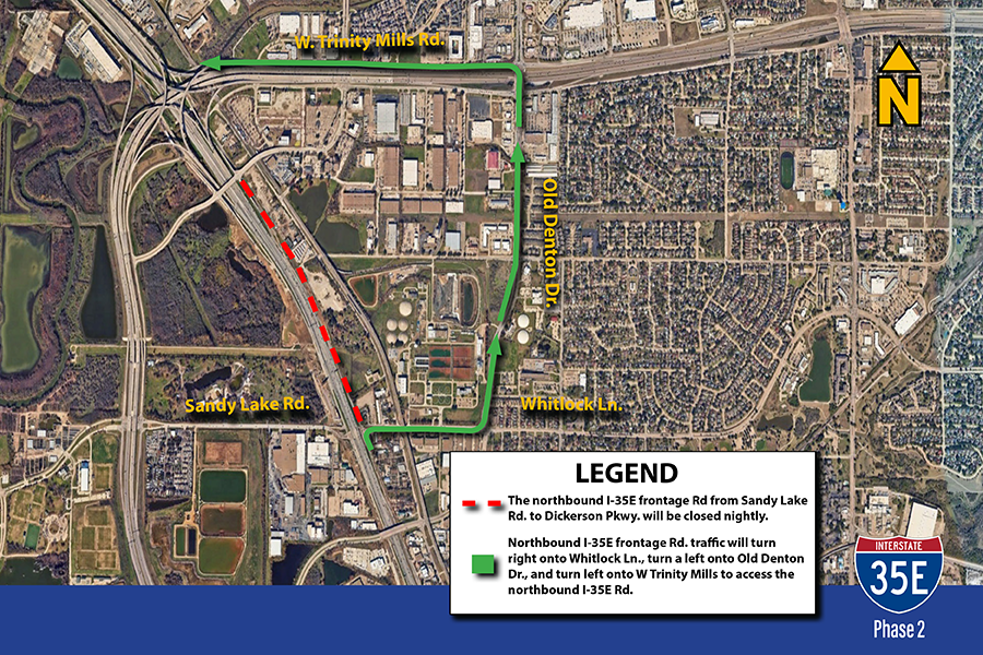 La carretera de servicio en dirección norte de la I-35E entre Belt Line Road y Sandy Lake Road estará cerrada desde las 21:00 horas del miércoles 11 de marzo hasta las 6:00 a.m. del jueves 12 de marzo y continuará cada noche hasta el domingo 15 de marzo.