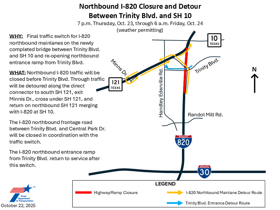 - Durante la noche, 23 de octubre, 8 p.m. al 24 de octubre, 6a: La carretera de acceso a la I-820 en dirección norte se cerrará entre Trinity Blvd y SH 10 en coordinación con el último cambio de tráfico para el proyecto, y para devolver al servicio la rampa de entrada de la I-820 en dirección norte al sur de la SH 10.