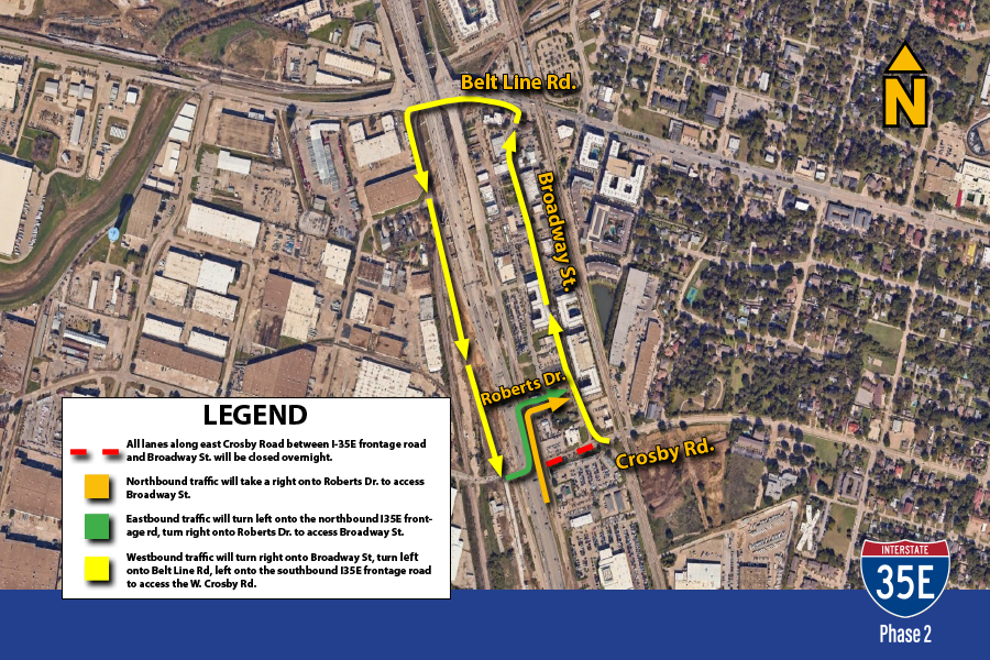 Todos los carriles a lo largo de Crosby Road en dirección este entre Broadway Street y la carretera de servicio norte de la I-35E estarán cerrados durante la noche desde las 20:00 horas del viernes 17 de abril hasta las 6:00 a.m. del sábado 18 de abril.