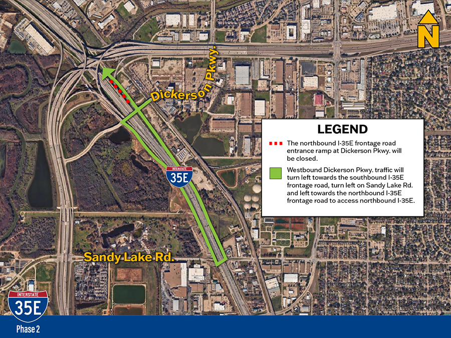 La salida de la carretera de servicio en dirección norte de la I-35E hacia Dickerson Pkwy. estará cerrada temporalmente a partir del domingo 19 de abril.