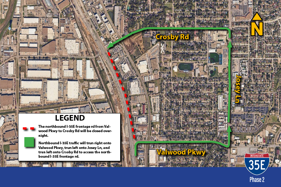 La carretera de servicio en dirección norte de la I-35E entre Valwood Parkway y Crosby Road estará cerrada durante la noche desde las 21:00 horas del lunes 13 de abril hasta las 6:00 del martes 14 de abril.