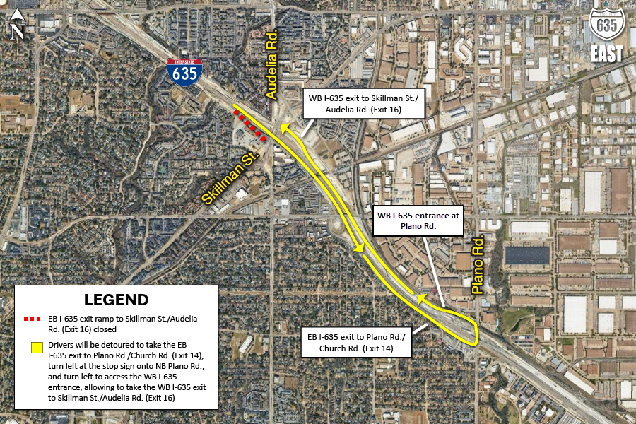 10/12/25 (de 8 p.m. a 5 a.m. del día siguiente) | Los conductores serán desviados para tomar la salida Oates/Galloway y recorrer la carretera de servicio hasta la siguiente entrada disponible a la I-635 en dirección norte entre La Prada Drive y Centerville Road/Ferguson Road. Los conductores que vengan de la I-30 en dirección este y oeste serán desviados por la rampa de conexión hacia el sur de la I-635 para dar vuelta en U en Town East Boulevard para seguir el desvío del carril principal. |