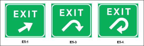 Exit Direction signs must include a destination and upward slanting arrow. If appropriate, Exit Direction signs must also include a cardinal direction, Route sign, Exit Number panel, and Exit Only panel.