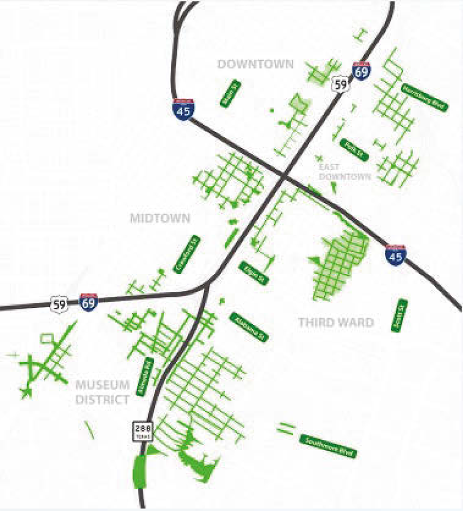 These proposed design changes would eliminate or reduce the roadway footprint along I-10 eastbound frontage road west of I-69, and west of Downtown near one set of the proposed downtown connectors.