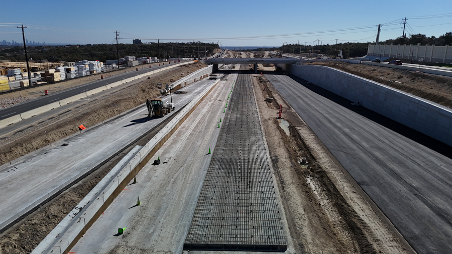 Rebar mats are installed along the future westbound US 290 mainlanes near the recently completed cross-street bridge at Scenic Brook Drive. February 2025