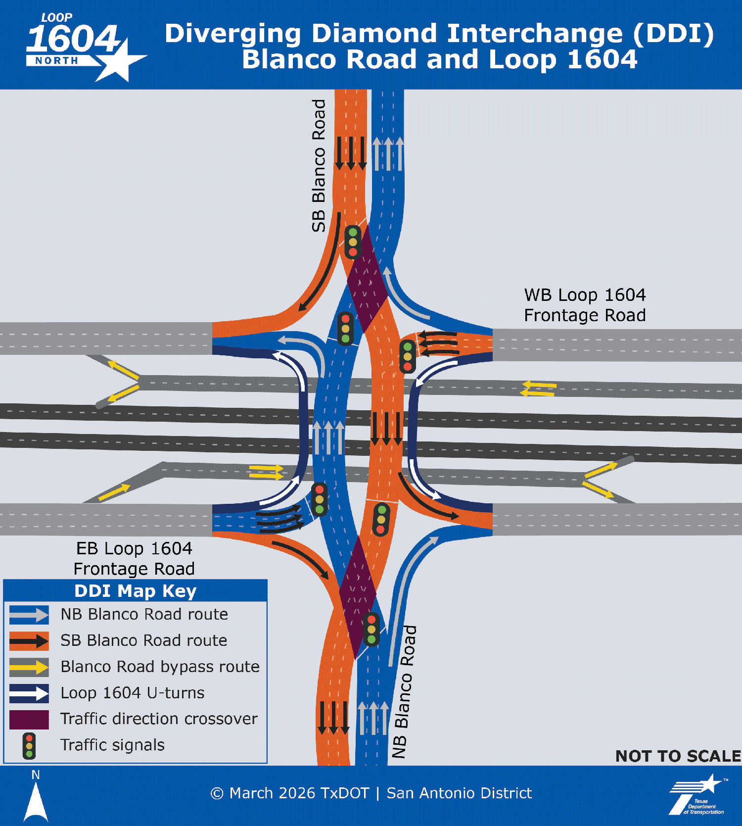 - Traffic on Blanco Road will shift to the left when crossing Loop 1604.