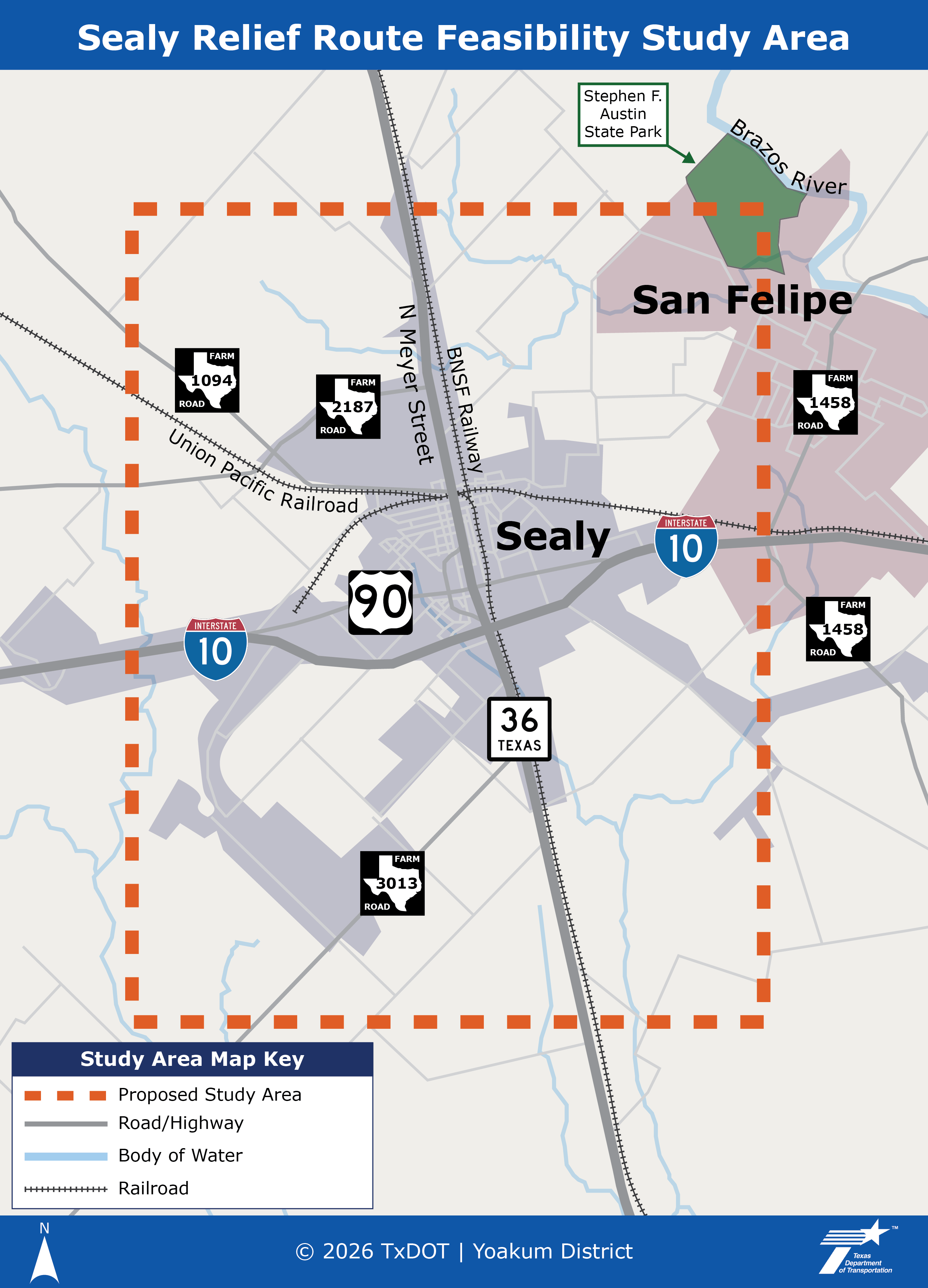 TxDOT Yoakum District is conducting a feasibility study to explore a potential relief route around the City of Sealy in Austin County. The purpose of the relief route is to help reduce congestion, while also improving safety and mobility.
